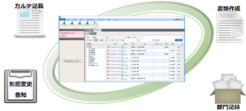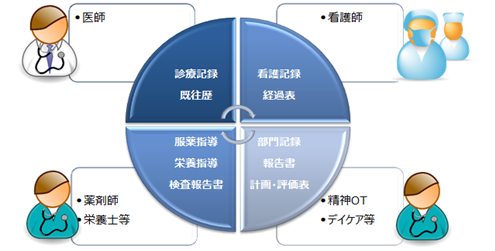 多職種間でのコミュニケーションツールにより、リアルタイムな治療状況を共有することが可能です。職種間を意識することなく、診療記録への書き込み閲覧が可能です。